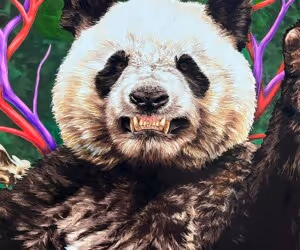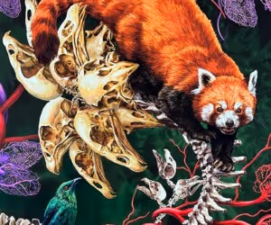 During spring 2024, Deborah Simon worked with Digital Print Lab Associate Director and Master Printer Dennis Hrehowsik to transform one of her digital paintings into a 45″ x 65″ digital print on a primed panel. This process involved extensive experimentation to most closely match the colors of the original Photoshop layers. Deborah hand gessoed and sanded the test panels with different primers to assess compatibility, printing the same image on the Swiss Q UV printer to identify which base yielded the best color results. After trial and error, they found that Titanium white served as the best primer, most accurately mimicking the colors of the Photoshop file. Precise color proofing was crucial for this print, as too much ink muted the colors and less ink could show the traces of the hand treatments on the panel. After printing, Deborah added hand-painted elements, such as white highlights and deeper blacks in the pandas, using acrylic ink. She also glazed heart vines and painted moths and birds to complete the delicate piece.