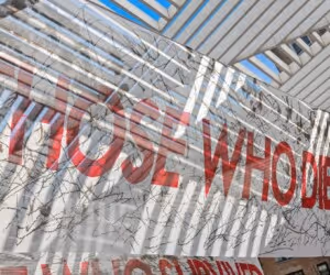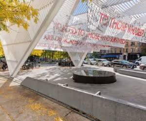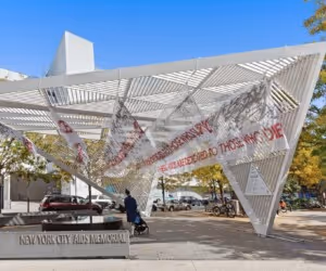 In 2023, artist Avram Finkelstein collaborated with Powerhouse Arts to create an installation above the New York City AIDS Memorial. In a collaboration between Powerhouse Arts Public Art and Print, the teams crafted five digital latex prints with hand-pulled silkscreen on polyester voile ranging from 21 to 37 feet wide. Additional materials: Steel cable rigging and aluminum stiffeners.