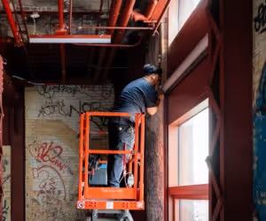 As Hollister-Colby notes, “We knew the taupe tone of the shade fabric would mute the overall printed palette, but that subtlety helped preserve the importance of the graffiti. The end result is, hopefully, a symphonic interplay between design and art: the soft ‘piano’ of the supporting shades and the bravura ‘fortissimo’ of the original graffiti.”