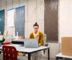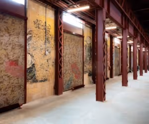 Originally conceived as hand-painted, the shades’ design had to be adapted when it became clear that painted surfaces were incompatible with the automated roller technology of the UV printer. Building on Gilda, Hollister-Colby extracted and refined a series of underlying shapes to form an idiosyncratic base pattern for each shade. She drew inspiration from the colors in the Grand Hall’s graffiti, incorporating complementary hues in expressive, carefully considered moments of color. Each shade layout responds to the artworks beside it as well as to the other shades in the series.