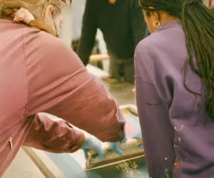 Rob Pruitt enlisted the expertise of Powerhouse Arts in 2024 to create a series of Digital UV and Hand-pulled Enamel Silkscreen screenprints titled Hoarfrost Pandas (A-H). Each of the eight images is an edition of 30 and is 19 x 15 printed on 27 3/4 x 20 1/4 on Silver Washi paper. In order to retain rich pigment of the colors on the Silver Washi Paper, the prints were first primed with a white base layer using our Digital UV printer. The second color Digital UV layer was then printed on top in different rainbow tones. In order to create a seamless effect of the rainbow color transitions, the Powerhouse Arts print team used both the digital UV printer and hand pulled the final rainbow layer to include a horizontal and vertical rainbow. The final layer was hand pulled in the printshop, consisting of a silkscreen enamel blend on top. The result is a crystalline highlighting of nature, rendering the panda and its environment ethereal. Each print captures the pandas in different states of existence in their habitat. The inspiration for the Hoarfrost Pandas comes from the phenomenon of hoarfrost, when moisture on a clear night becomes frozen and creates a feathery, fluffier frost, and features Pruitt’s iconic panda immersed in the cool, glistening environment.