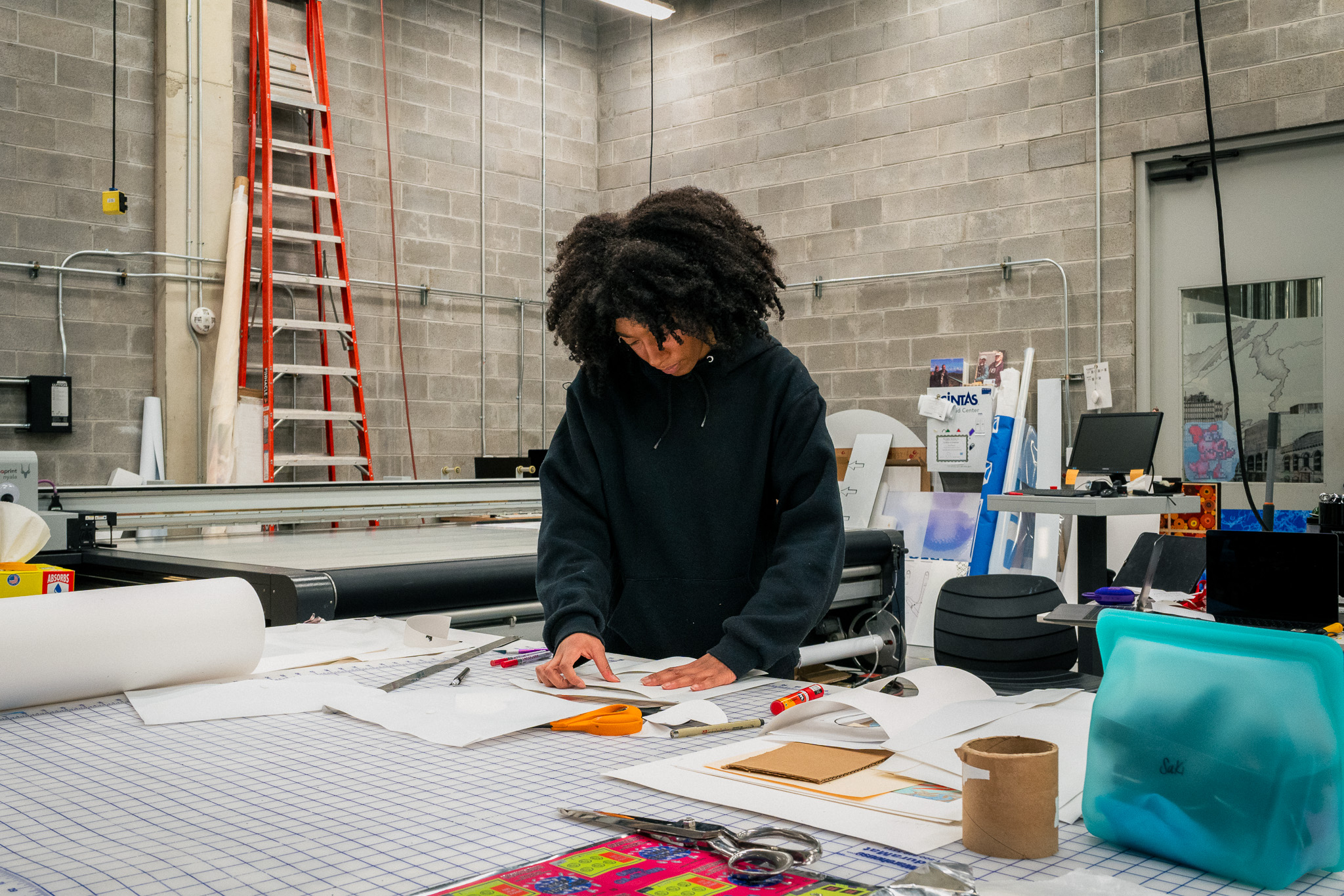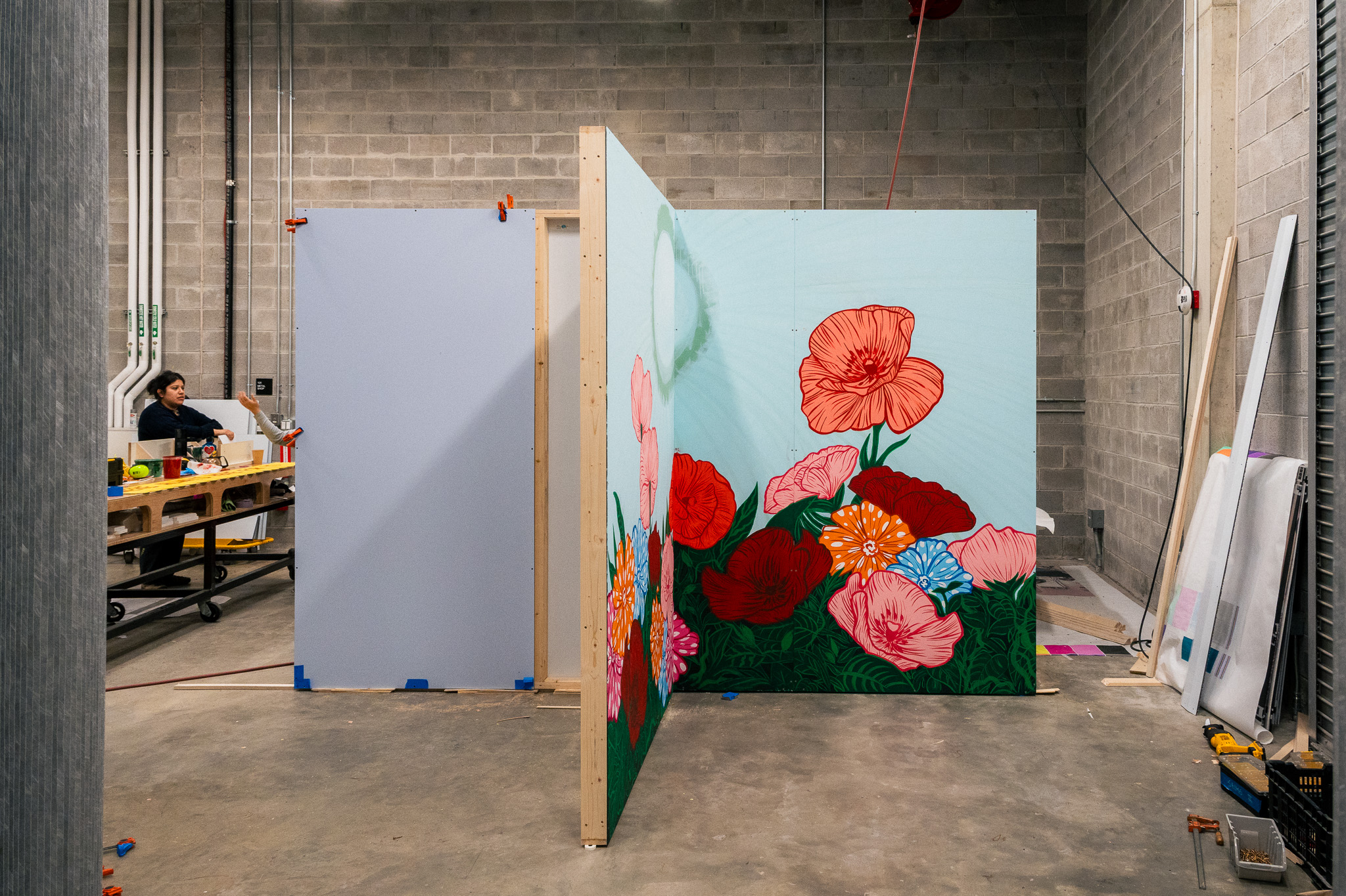 Each quadrant of "Making Love" highlights a distinct fabrication process, illustrating how artists’ concepts are translated into immersive, physical environments. Hand-painted murals, Dürer-inspired drawings reproduced at large scale, and customized bodega merchandise were produced in the Digital Print Lab at Powerhouse Arts using UV printing on Dibond panels. Within the bodega scene, many of the items on display were individually designed and fabricated by hand, including sewn food items that replicate familiar products through careful construction and detail. These hand-crafted elements are presented alongside sculptural components across all four quadrants—including trellises, hedges, proscenium frames, canoes, and a bodega counter—to create layered spaces that visitors can experience from within. Together, these techniques emphasize the collaboration between artists and fabricators, highlighting the care, skill, and processes that bring each scene to life.