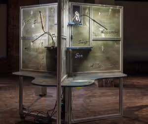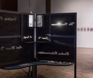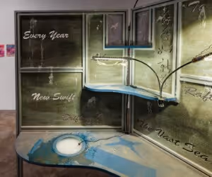 An alienating melody composed by sound artist Lemon Guo provided additional texture to the installation, creating a foreboding and anxious atmosphere. The artist also worked with engineer Menyu Chen to develop and train artificial intelligence to translate verses from classical Chinese poetry into English, which appear as cut-outs in the panels.