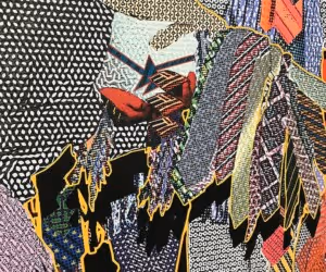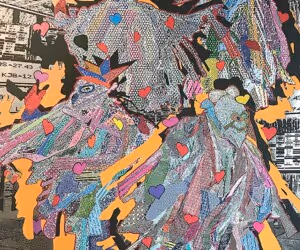 For this project, Powerhouse Arts’ print team produced three large-format prints on canvas measuring 59 inches by 76 inches. The original material was sourced from a video installation presented in 2019 at MASS MoCA. The imagery is collaged and then outputted on canvas by a combined process of large-format Epson digital printing and screen printing. The colors were applied via four large screens measuring 120 by 73 inches frame size — the largest offered by the Print Shop. The process required several passes of ink to achieve the desired texture and sheen. Metal leaf was applied to the surface of the works by the artists as a final element.