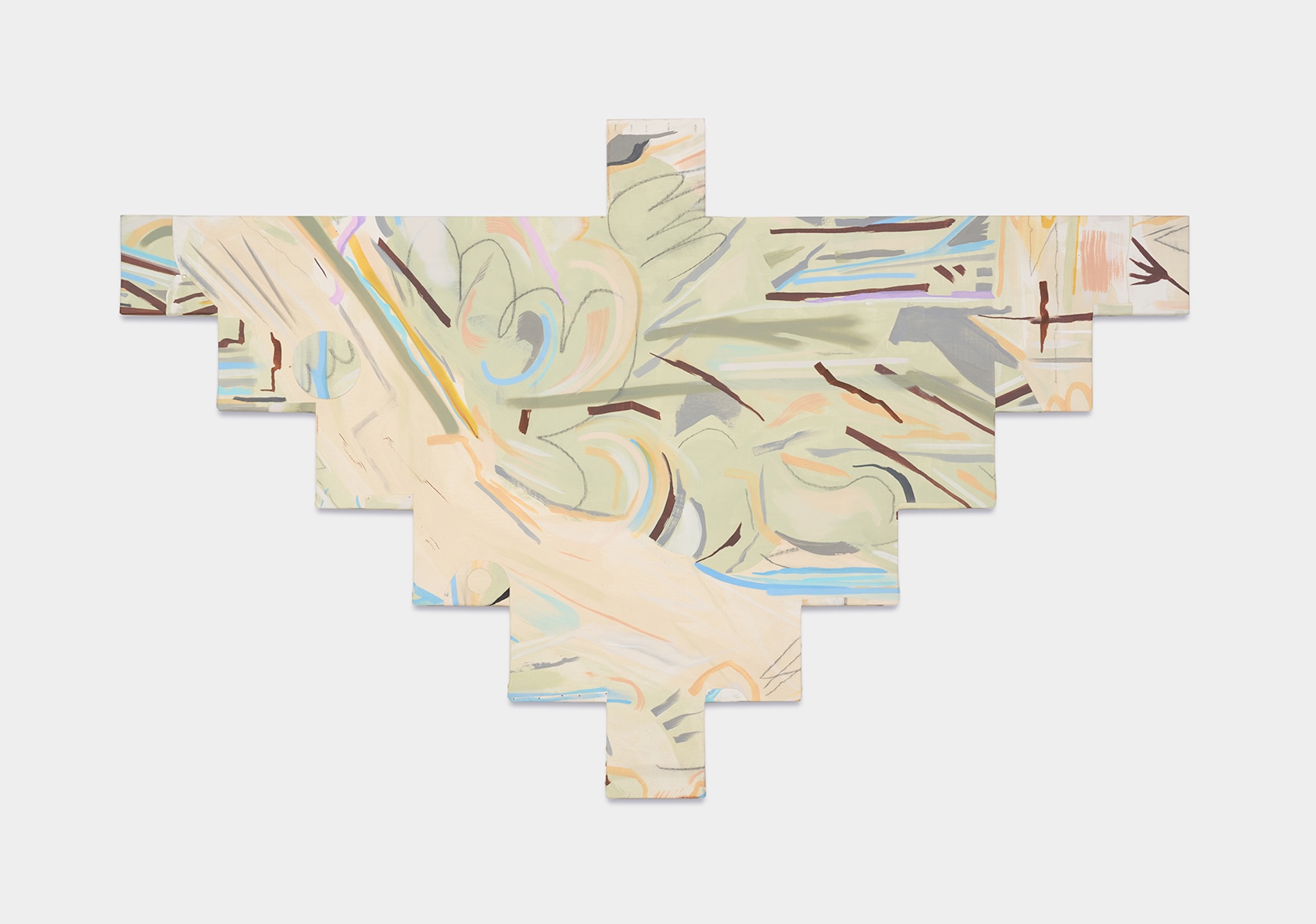 2) Matthew Kirk, Title forthcoming, 2026, mixed media on canvas and upholstery tacks on MDF, 42 x 66 in. Credit: Courtesy the artist and Bockley Gallery. Artist Instagram: @navajothunder
