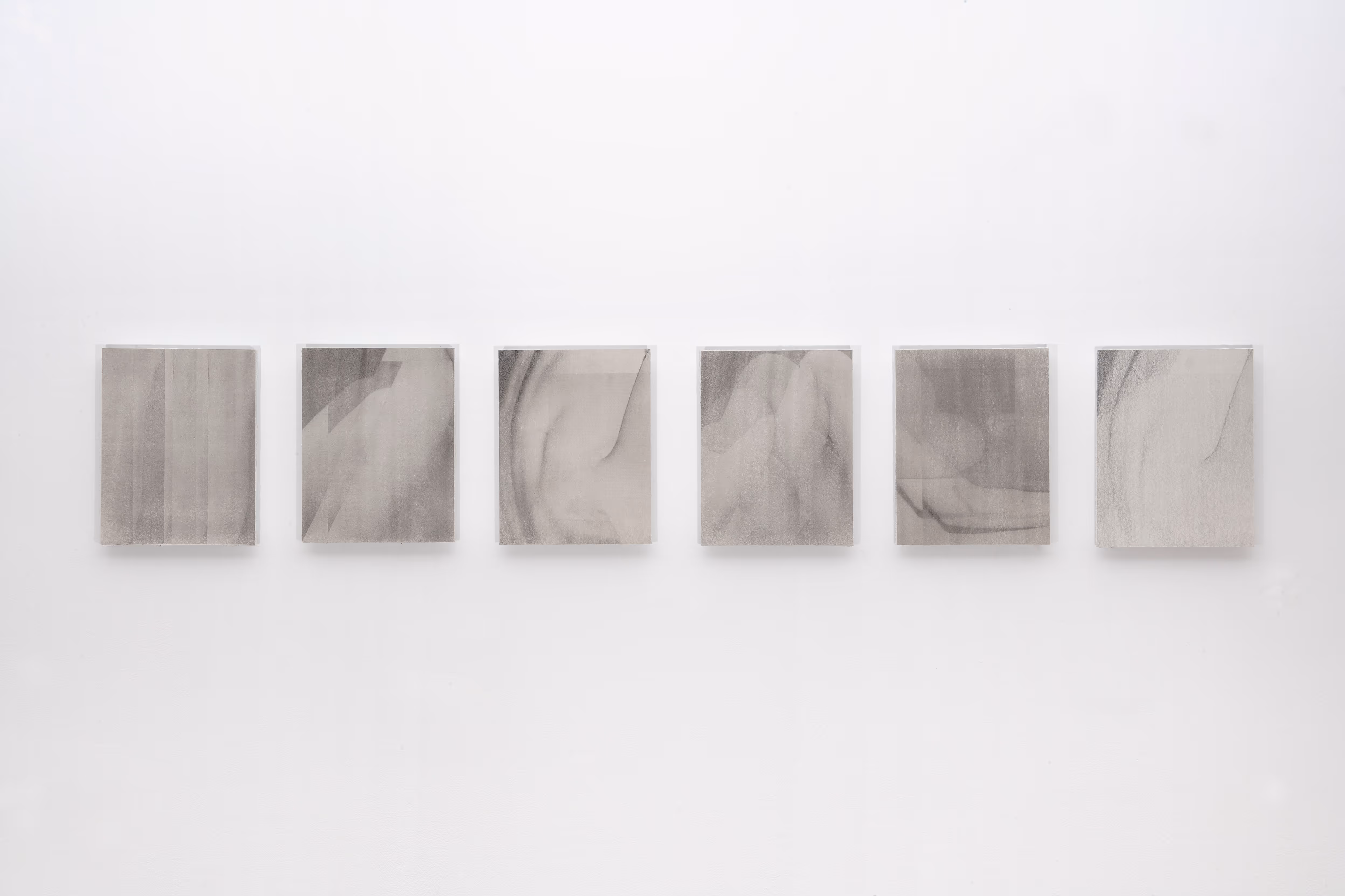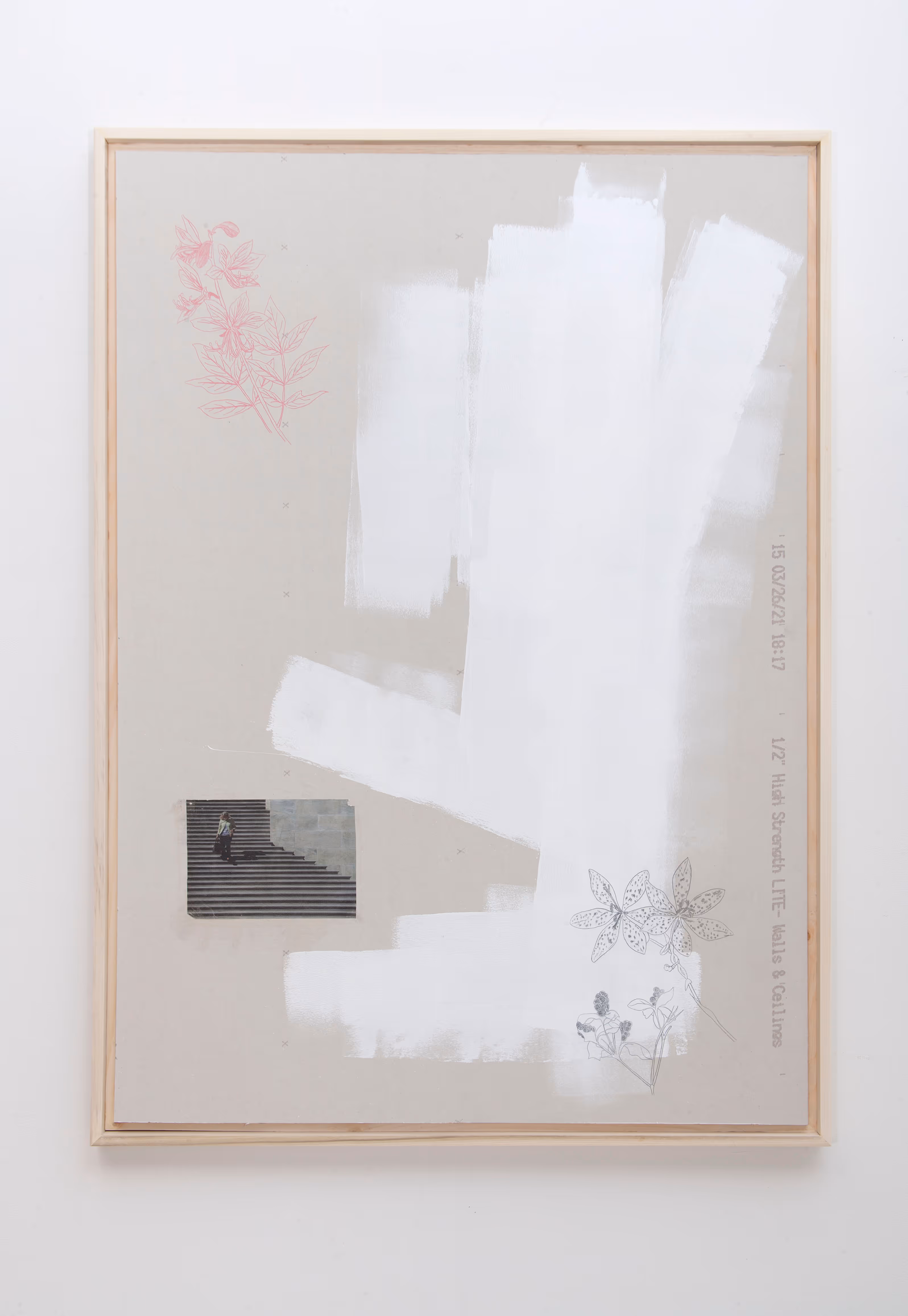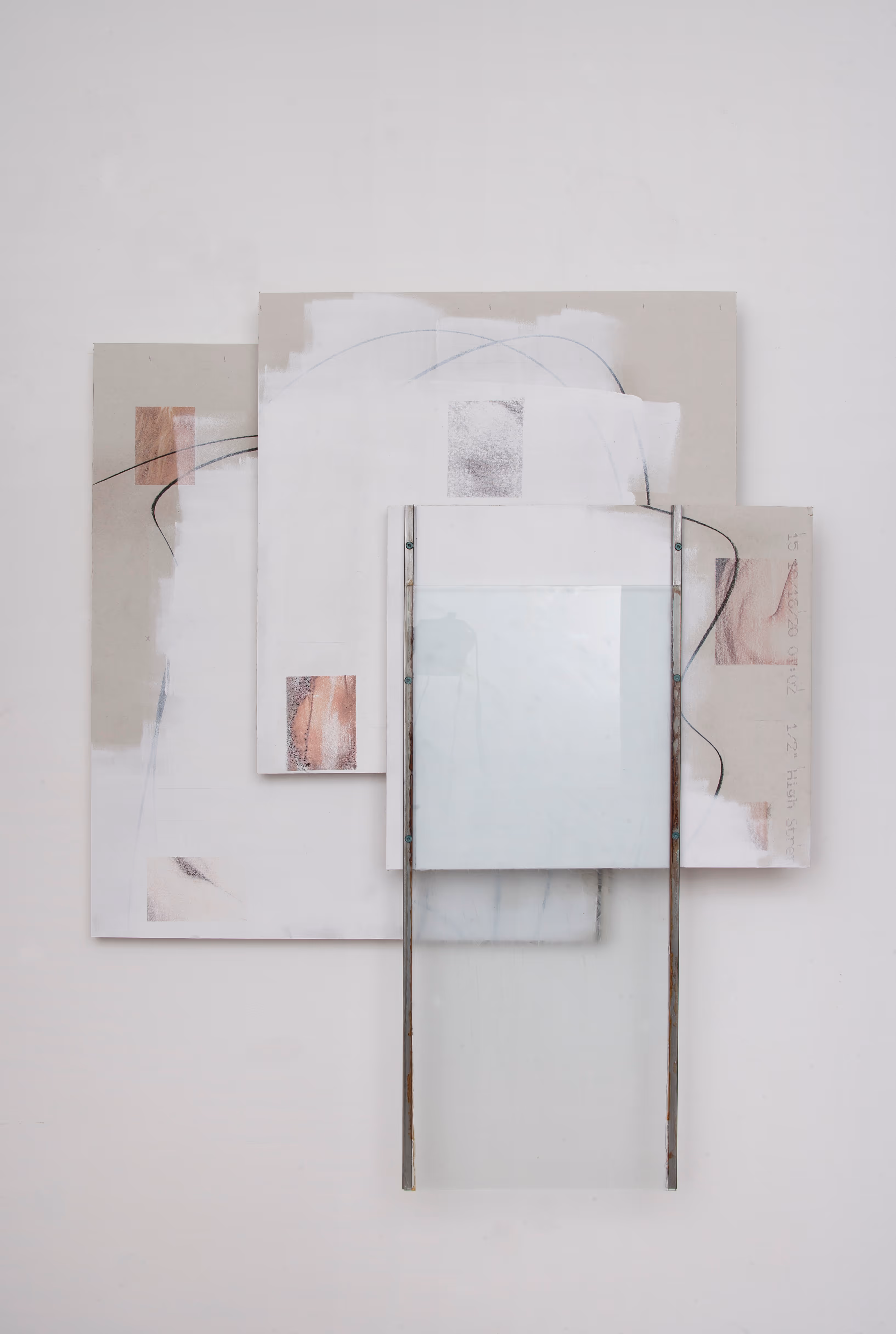 gypsum panel, steel, paint, glass, inkjet print transfer, wood, charcoal
