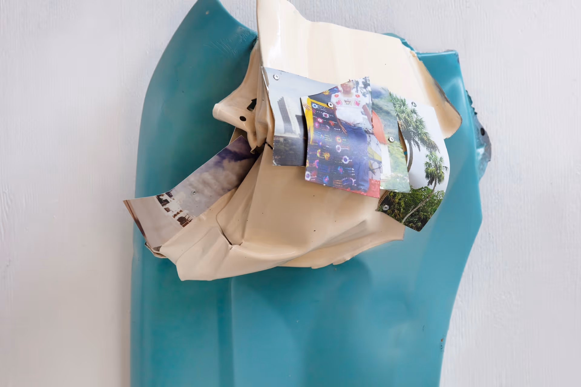 Salvage metal, aluminum photographs, enamel paint, rivets