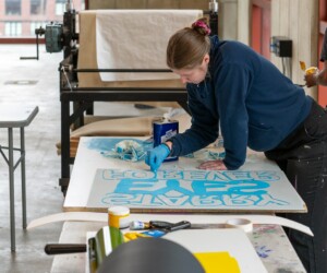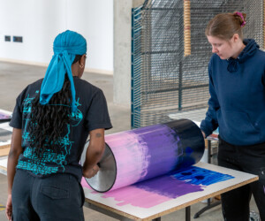 Starry Eyes Forever allowed Alex Dodge and the Powerhouse Arts Printshop team to flip the relief process of woodcuts, the oldest form of printmaking, on its head through additive new digital approaches coupled with intensive hand-applications. The plates were created through an additive process of layering epoxy on PHA’s UV printer; the colors were then hand-rolled onto each plate, and finally run through the press individually. This relief print is very reflective of Dodge’s painting process, through which he builds thick layers of paint.
