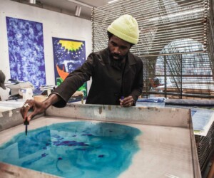 Ivan Forde’s Fall Of Man is a keystone of the artist’s radical approach to self portraiture and stems from his “Transformations” series, which explores the cognitive effects of John Milton’s Paradise Lost on contemporary readers. In his work on this edition created at Powerhouse Arts, Forde expanded upon his decade-long experimentation in cyanotype by adding layers of silkscreen and batik dye. Fall Of Man is a statement on perception and ways of seeing, emphasizing the contrast between tonal and graphic modes of representation, the poetic imaginary, and lived experience.