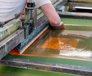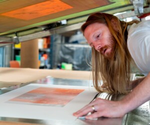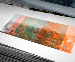 Throughout her work, Julia Wachtel pulls imagery from the internet to create multivalent dichotomies and commentary on climate change and the environment, pop culture, and consumerism. The seven screenprinted layers in Accumulation echo Wachtel’s painting process; the repeating oil refinery imagery stems from her recently completed, not yet exhibited painting Glare v.2, 2023. Wachtel enjoyed a very collaborative process with the Powerhouse Arts Printshop team, building bars of pastel colors to provide a support system for the vibrating screenprinted layers of refineries and repeating “bling baby.”