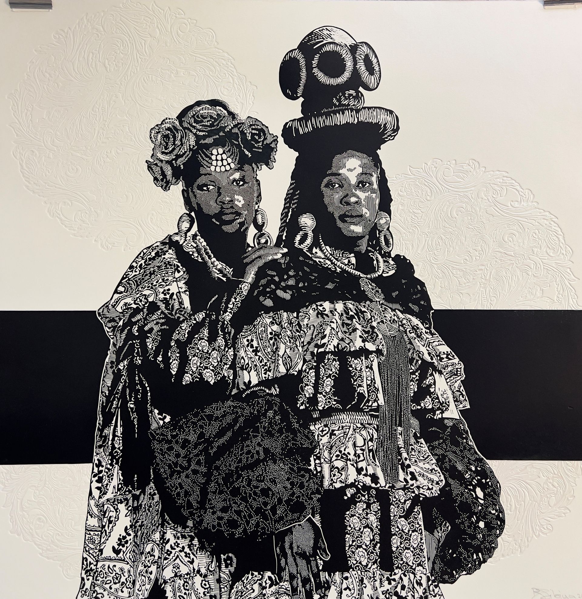 Bamba Sibiya. Sister, I got your back, 2025. Linoleum cut with embossing. 90 x 90 cm. Printed and published by the Artist.