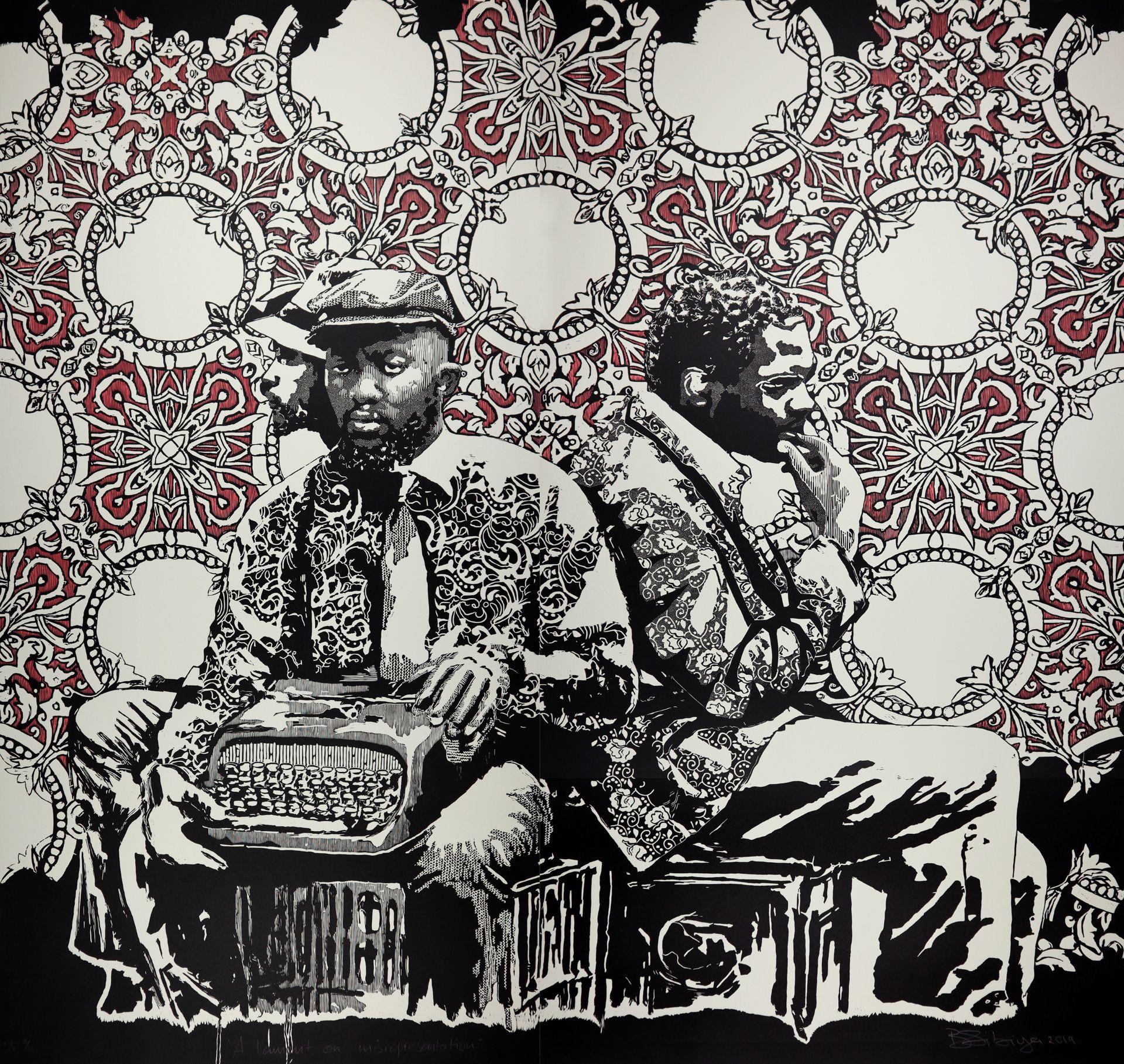 Bambo Sibiya. Lamenting upon the misrepresentation of the African culture, 2023. Linoleum cut. 2 x 2 meters. Printed and published by the Artist.