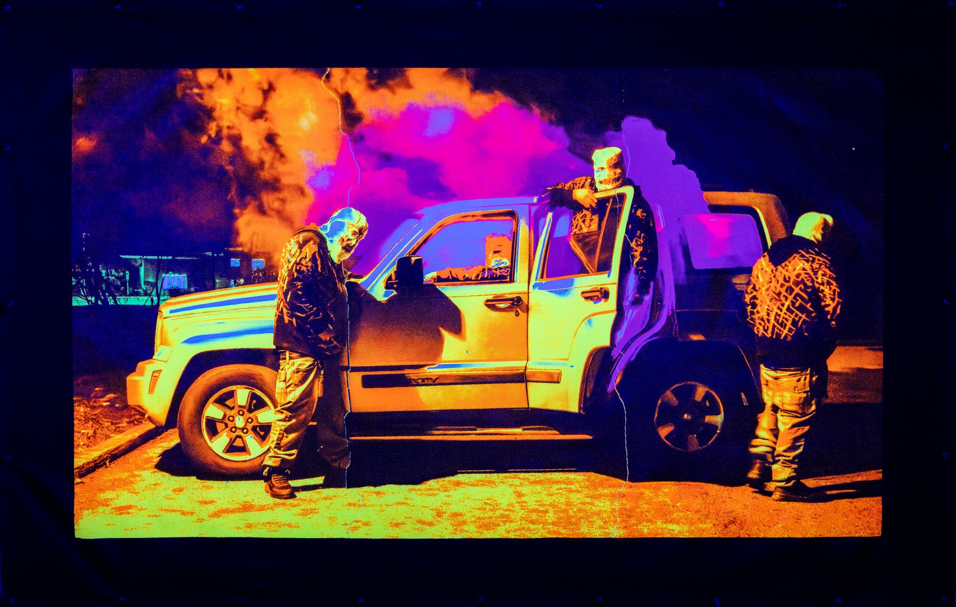 Dadisi Curtis. The Shame in Mirth, 2025. Screenprint on fabric under blacklight. 25 Β½ x 43 Β½ in. Printed and published by the Artist.