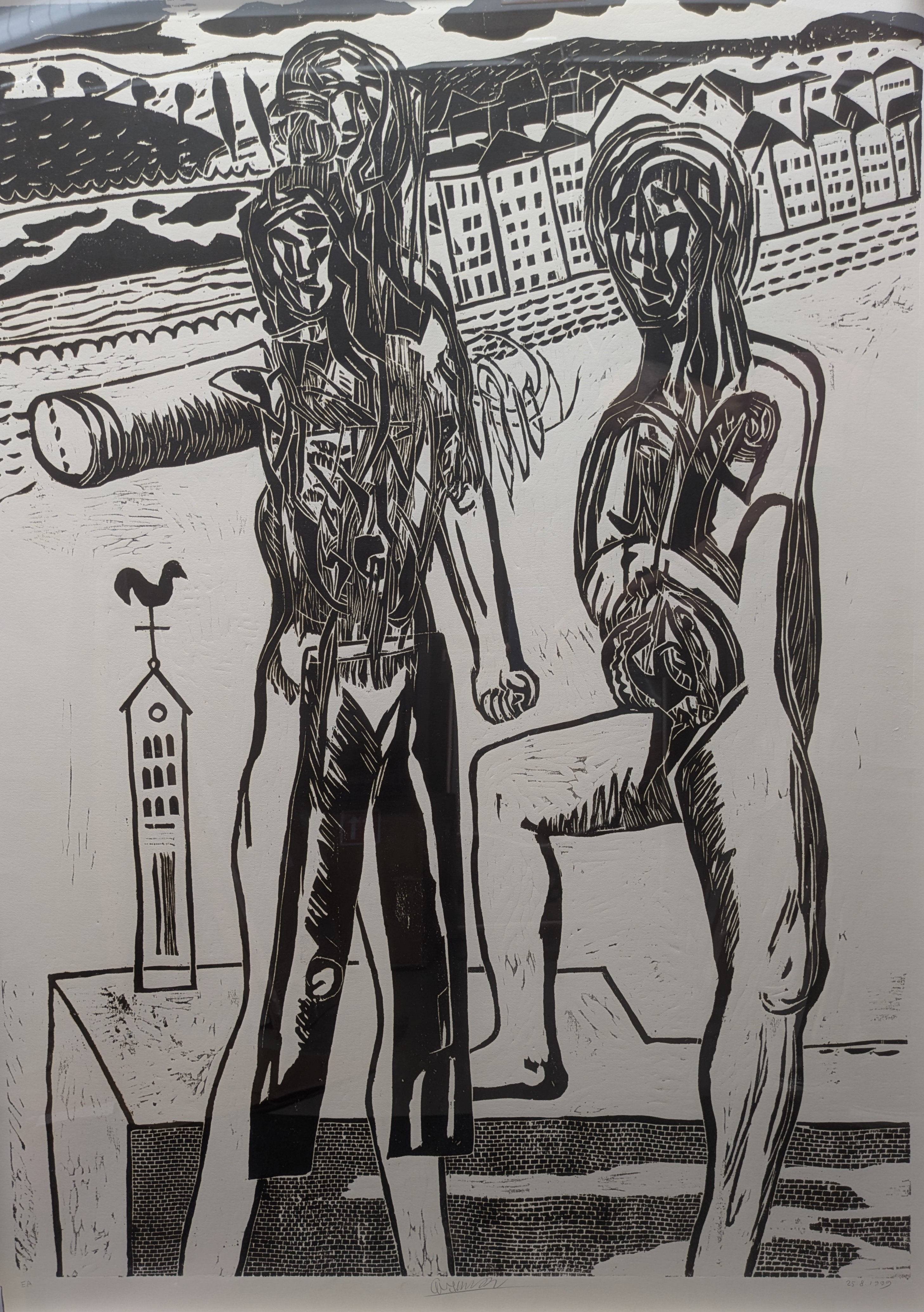 Wu Song Ming. Two Figures, Aachen. Woodblock print. Frame:40 x 53 in.