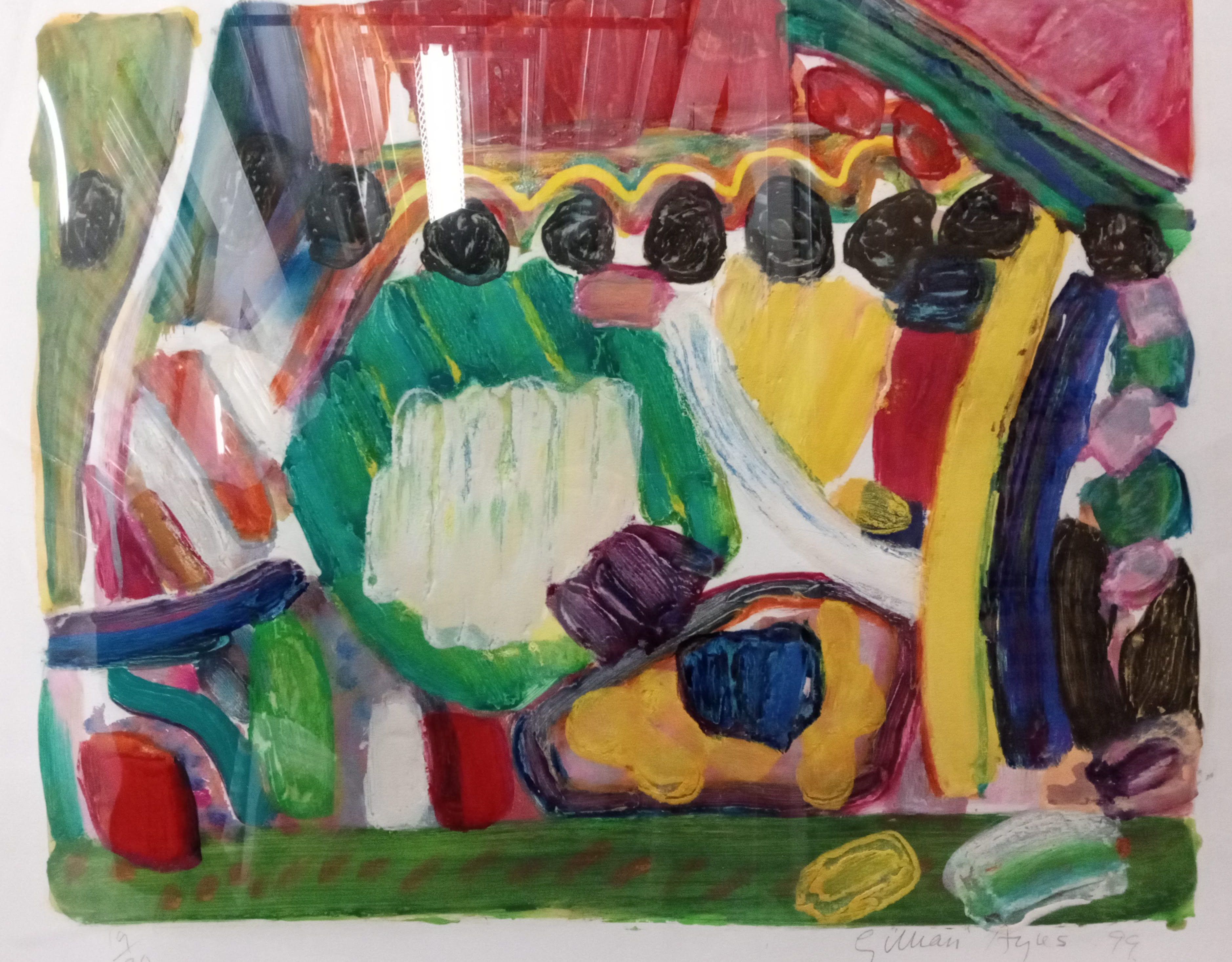 Gillian Ayres. Greenwellβs Glory, 1999. Etching with carborundum printed in colors,Β extensively hand-colored in acrylic. Frame:29 x 25 in.