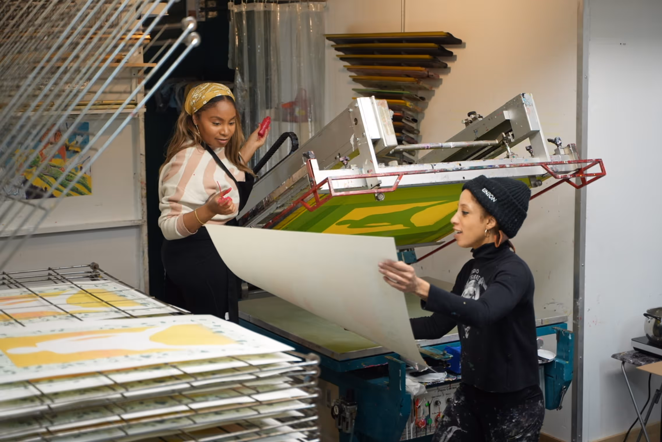 Angela Pilgrim (left) and Leslie Diuguid (right) collaboratively screenprinting. Photo by Alverson Layne.