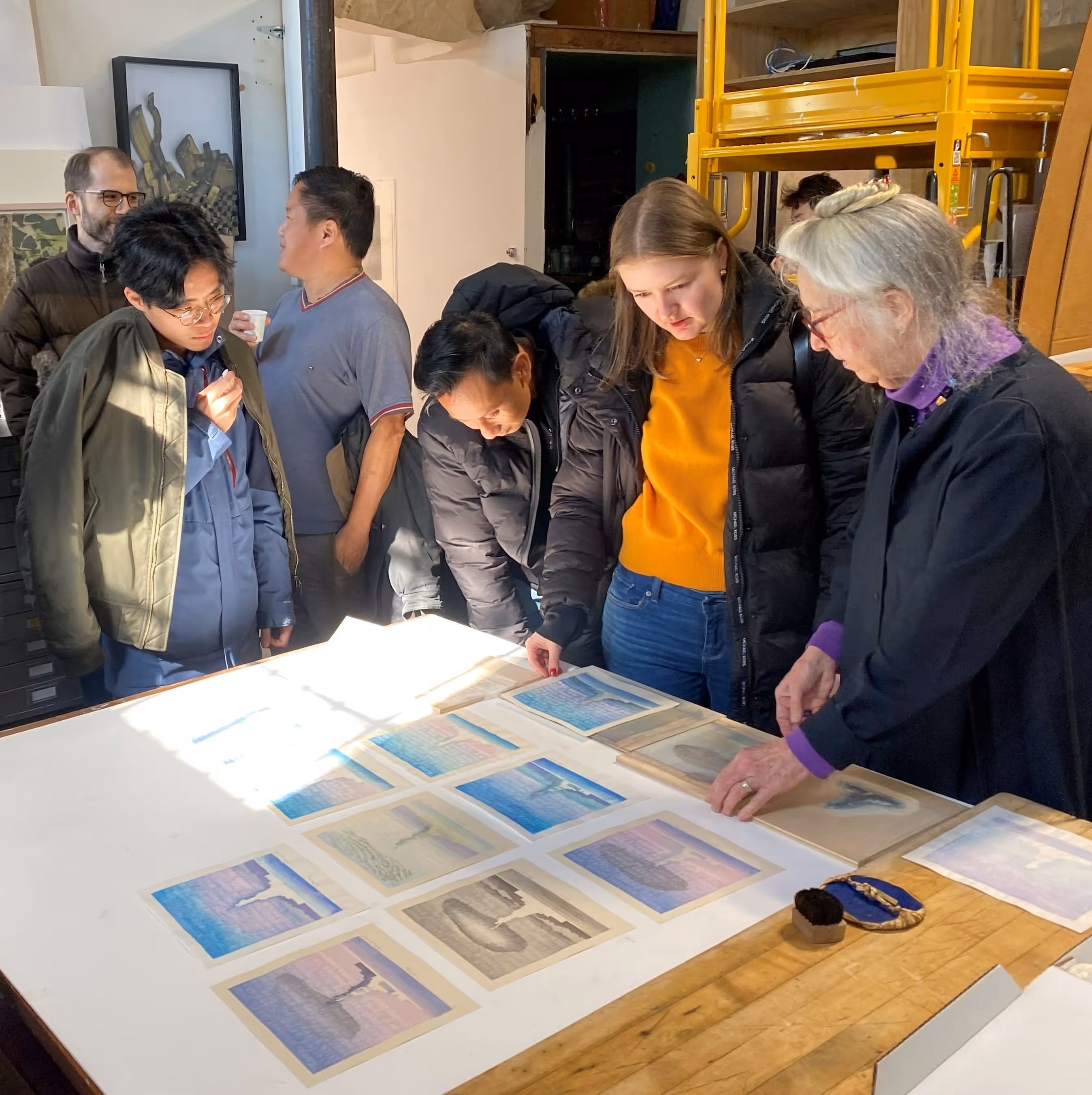Artist & Kentler co-founder Florence Neal showing her Liberty mokuhanga series to Elena Platonova and friends in the Kentler Flatfiles showroom.