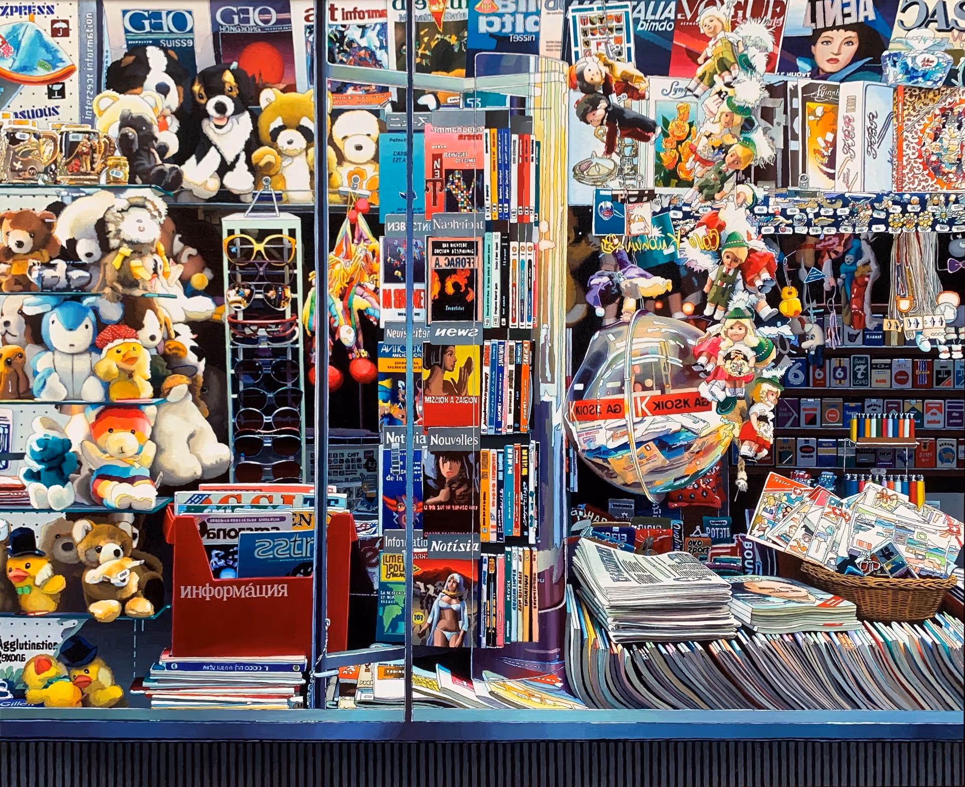 During the β80s, Sato developed his signature Newsstand Series,depicting New York newsstands through a distinctive hyperrealist style marked by bold outlines, altered magazine covers, and mirrored text. The series reflects the density, diversity, and visual overload of New York, while addressing the challenges of cultural translation between East and West. Art historian Edward Lucie-Smith later described these works as allegories of communication and artistic isolation.