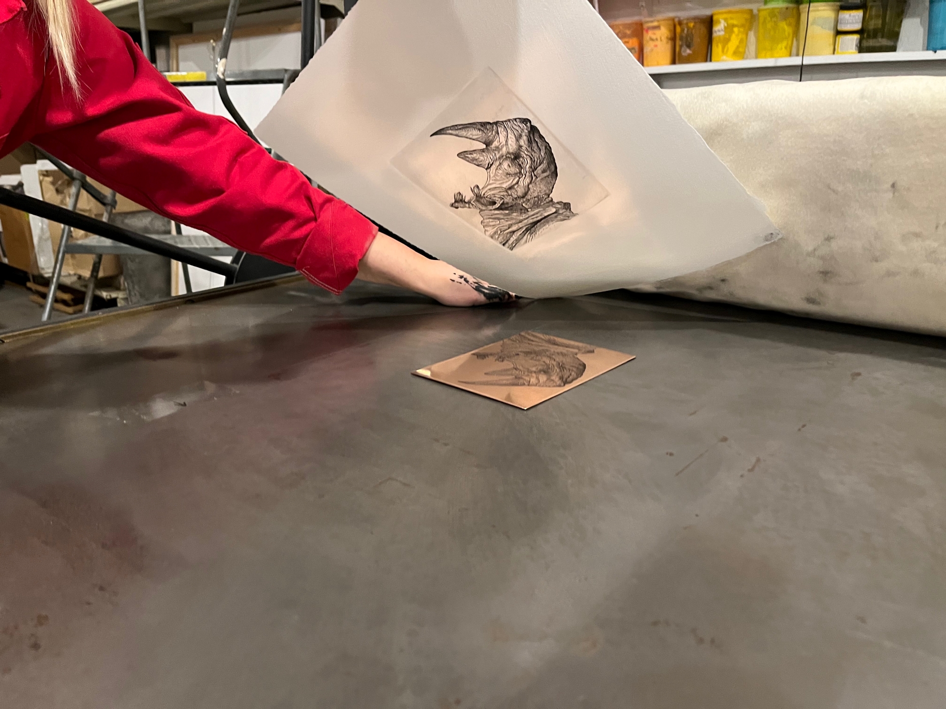 Printing Assistant Hannah Martin lifting a copy of Rhinoceros by David Barthold off the press, 2014.Β
