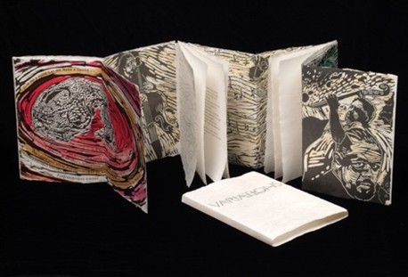 Lynn Sures. VARIATIONS on the Dialectic between Mingus and Pithecanthropus erectus, 2005. Artistβs accordion-bound book of handmade paper, pulp painting, woodcut, watermark. Text by Rick Potts; printed by Terrence Chouinard. 10 1/2 x 7 1/2 x 1/2 in.