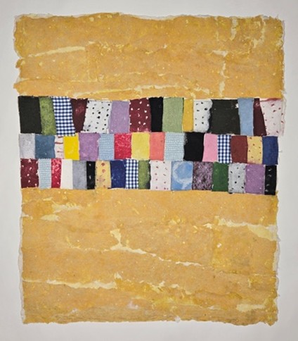 Ellen Hill. Yellow Ochre Patchwork, 2025. Pulp painting with fabric. 21 1/2 x18 Β½ in.