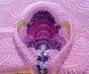 Inspired by the protective carapace of many arthropods, the sculpture is adorned with a mosaic of nearly 400,000 bedazzled acrylic fingernails, hundreds of which are hand painted by local nail artists. Inside the sculpture resides a vibrant multi-tiered fountain that sings a collection of pop and hip-hop anthems that embody survival. Visitors are invited to toss specially made tablets, or “Wishing Wafers” into the water, effusing a scent of Florida Water as they fizz and dissolve in an offering to survivors of all kinds.