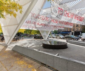 In this newly-commissioned installation, Finkelstein has designed six translucent panels to form a conceptual “sky” of memory and witnessing that floats above the “earth” of the New York City AIDS Memorial’s granite pavers and the reflective waters of the fountain below. These panels layer loosely rendered, hand-drawn clouds—a new style emerging for the artist which documents a reacquaintance with his own “disobedient body” after a stroke several years ago—and text that has been taken from the 1982 poem Bashert, by Irena Klepfisz: “These words are dedicated to those who died,” and “These words are dedicated to those who survived.” Seen through one another, these panels constitute a dialogue with the Memorial site, its emotional intentionality, and its uses of shadow and light.