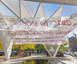 In 2023, artist Avram Finkelstein collaborated with Powerhouse Arts to create an installation above the New York City AIDS Memorial. In a collaboration between Powerhouse Arts Public Art and Print, the teams crafted five digital latex prints with hand-pulled silkscreen on polyester voile ranging from 21 to 37 feet wide. Additional materials: Steel cable rigging and aluminum stiffeners.