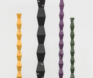 The columns are incised with eyes, a leitmotif in Sherman’s work that implies the works are animate and self-aware, further reinforcing the sentient qualities of his work. The eyes are hand-rendered, an intentional juxtaposition against the rigid geometry and precise angles of the columns.