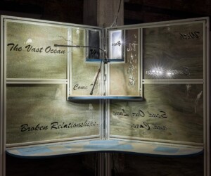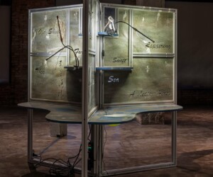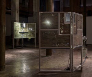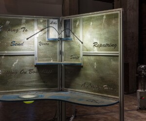 An alienating melody composed by sound artist Lemon Guo provided additional texture to the installation, creating a foreboding and anxious atmosphere. The artist also worked with engineer Menyu Chen to develop and train artificial intelligence to translate verses from classical Chinese poetry into English, which appear as cut-outs in the panels.