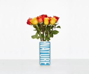 Performa’s curator Kathy Noble worked with Powerhouse Arts Ceramic Studio Director Biata Roytburd and Ceramic Studio Fabricator Eleni Kontos to create Barbara Kruger’s first vase with the words CULTURE and NATURE in black and blue in Kruger’s signature Futura Bold typeface style from the 1980s. The pieces were slipcast and underwent a finishing process, glazed in a bright white glaze, and finally adorned with silk screened decals.