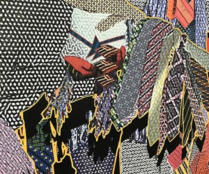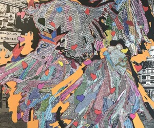For this project, Powerhouse Arts’ print team produced three large-format prints on canvas measuring 59 inches by 76 inches. The original material was sourced from a video installation presented in 2019 at MASS MoCA. The imagery is collaged and then outputted on canvas by a combined process of large-format Epson digital printing and screen printing. The colors were applied via four large screens measuring 120 by 73 inches frame size — the largest offered by the Print Shop. The process required several passes of ink to achieve the desired texture and sheen. Metal leaf was applied to the surface of the works by the artists as a final element.